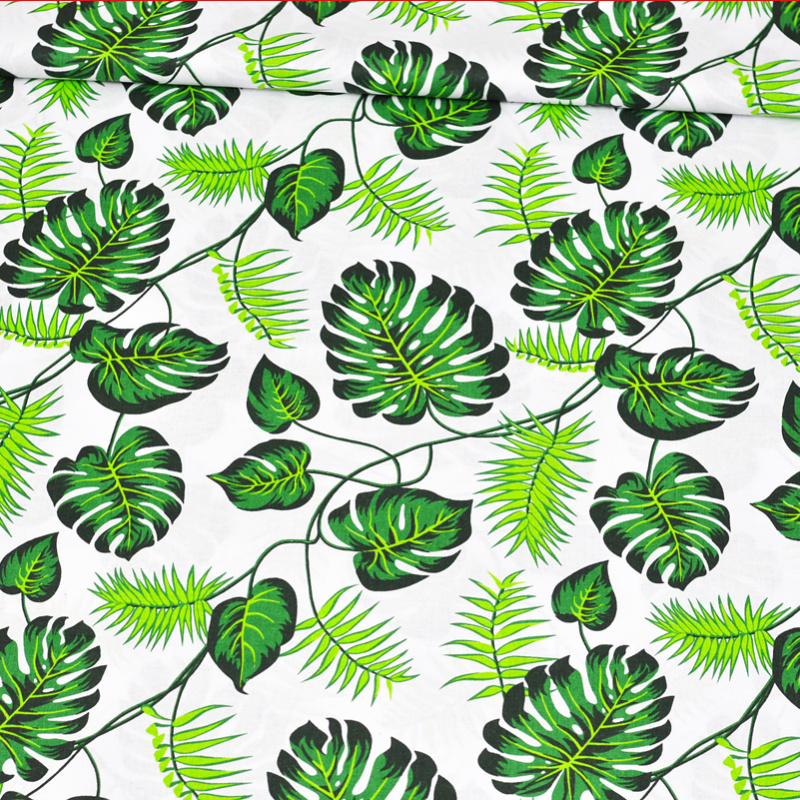 Description Tissu en coton au mètre, 125 g/m², largeur 160 cm, imprimé à palmes vertes sur fond blanc