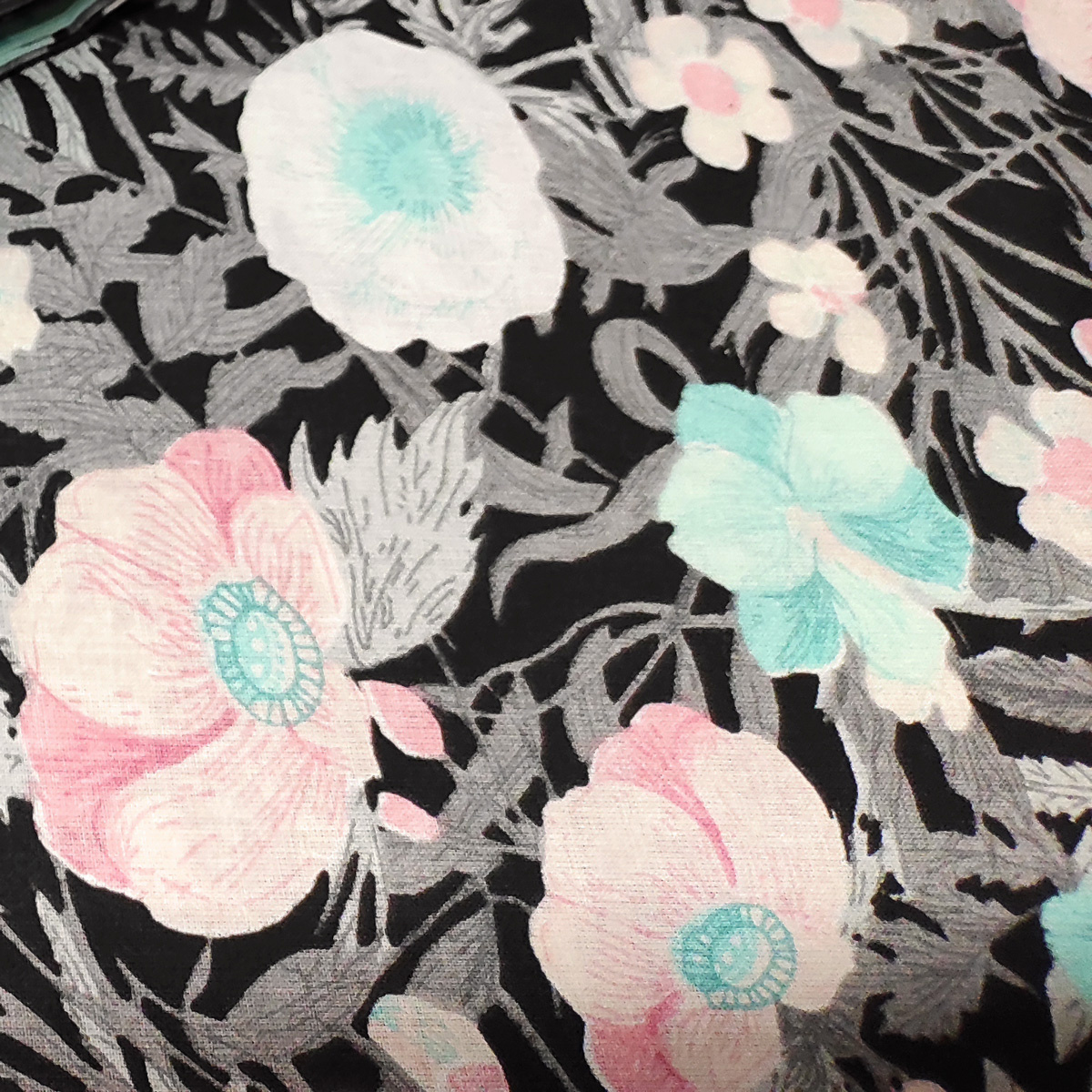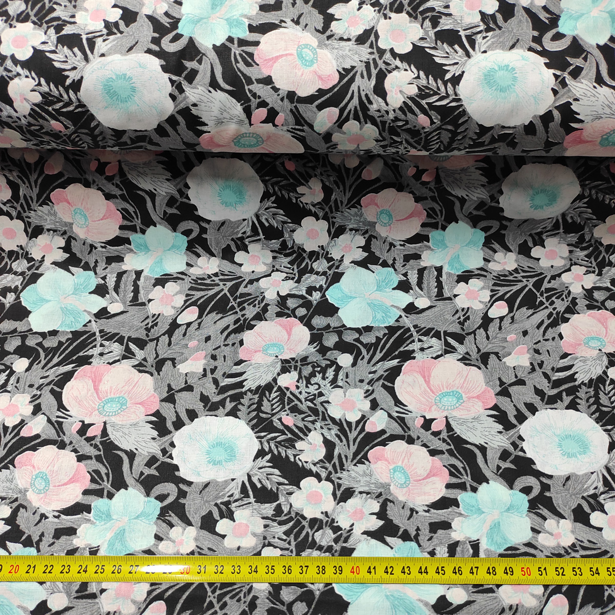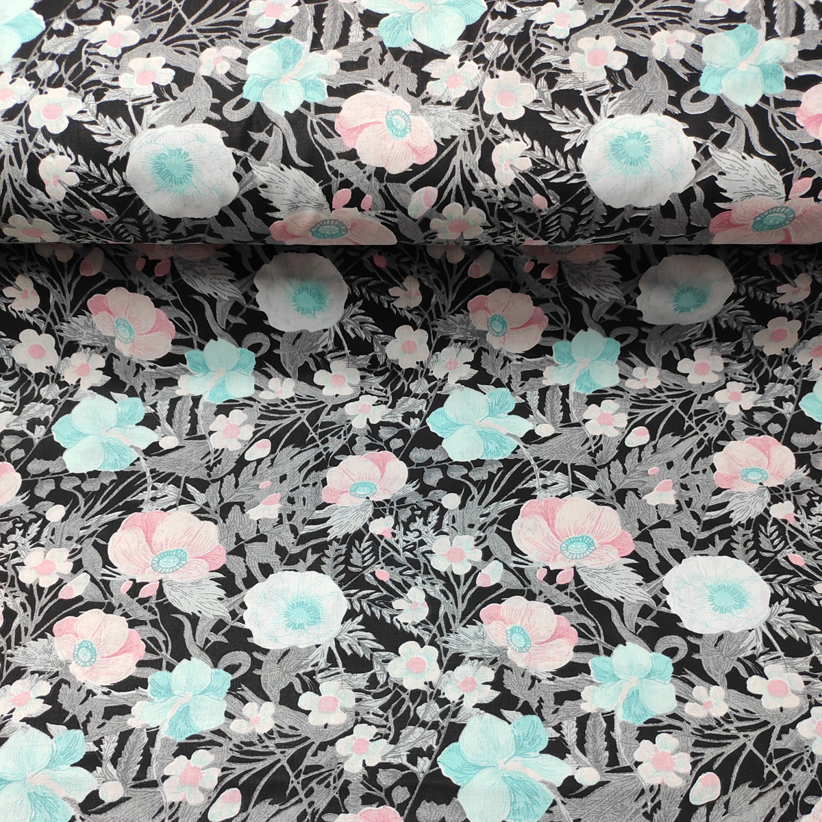 Description Tissu en coton au mètre, 125 g/m², largeur 160 cm, imprimé à fleurs noires