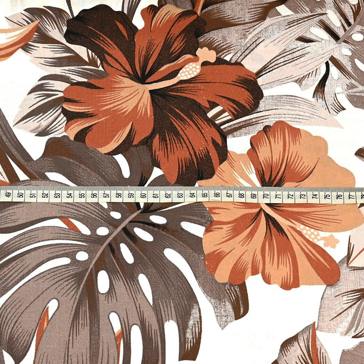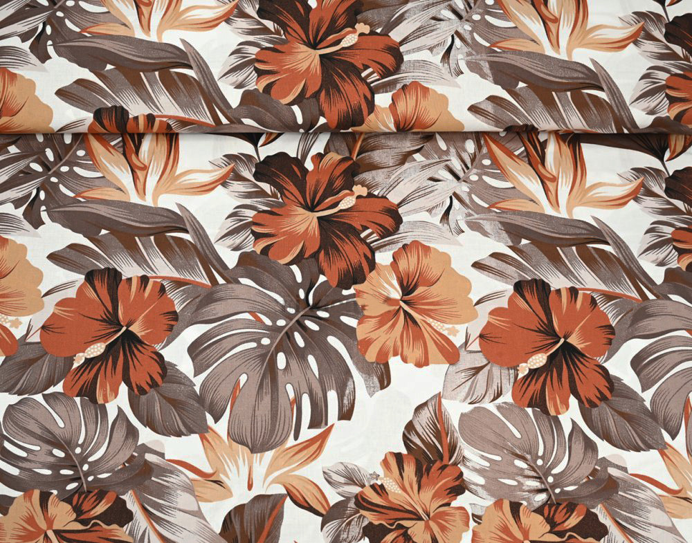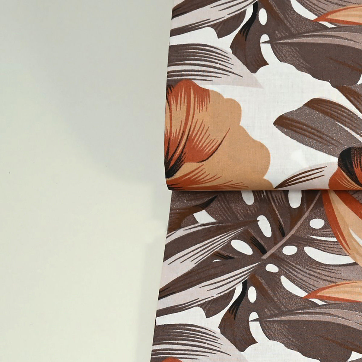 Description Tissu en coton au mètre, 125 g/m², largeur 160 cm, imprimé à monstera marron sur fond blanc
