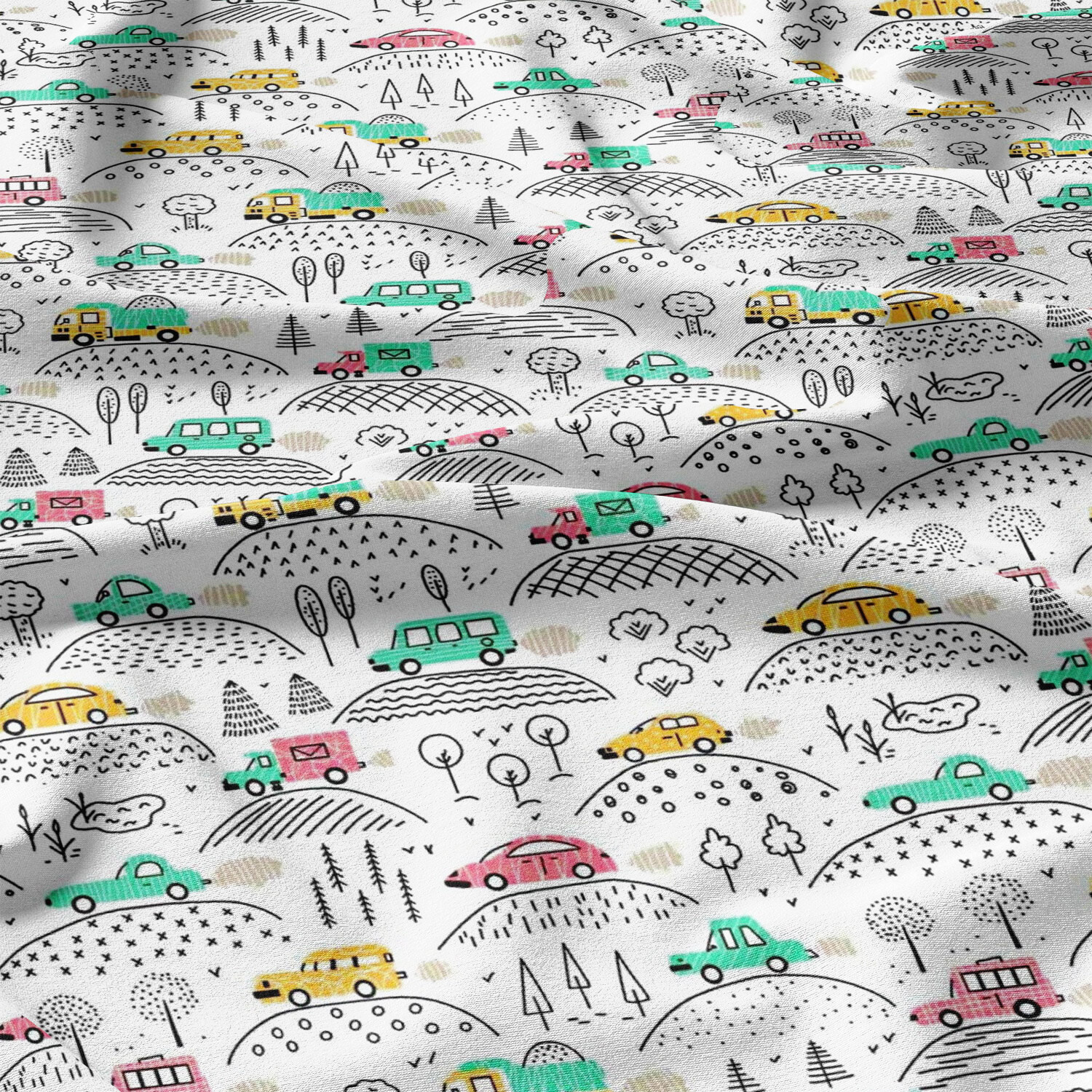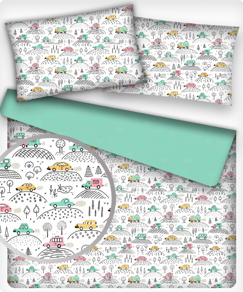 Description Tissu coton au métre imprimé Voitures menthol modern