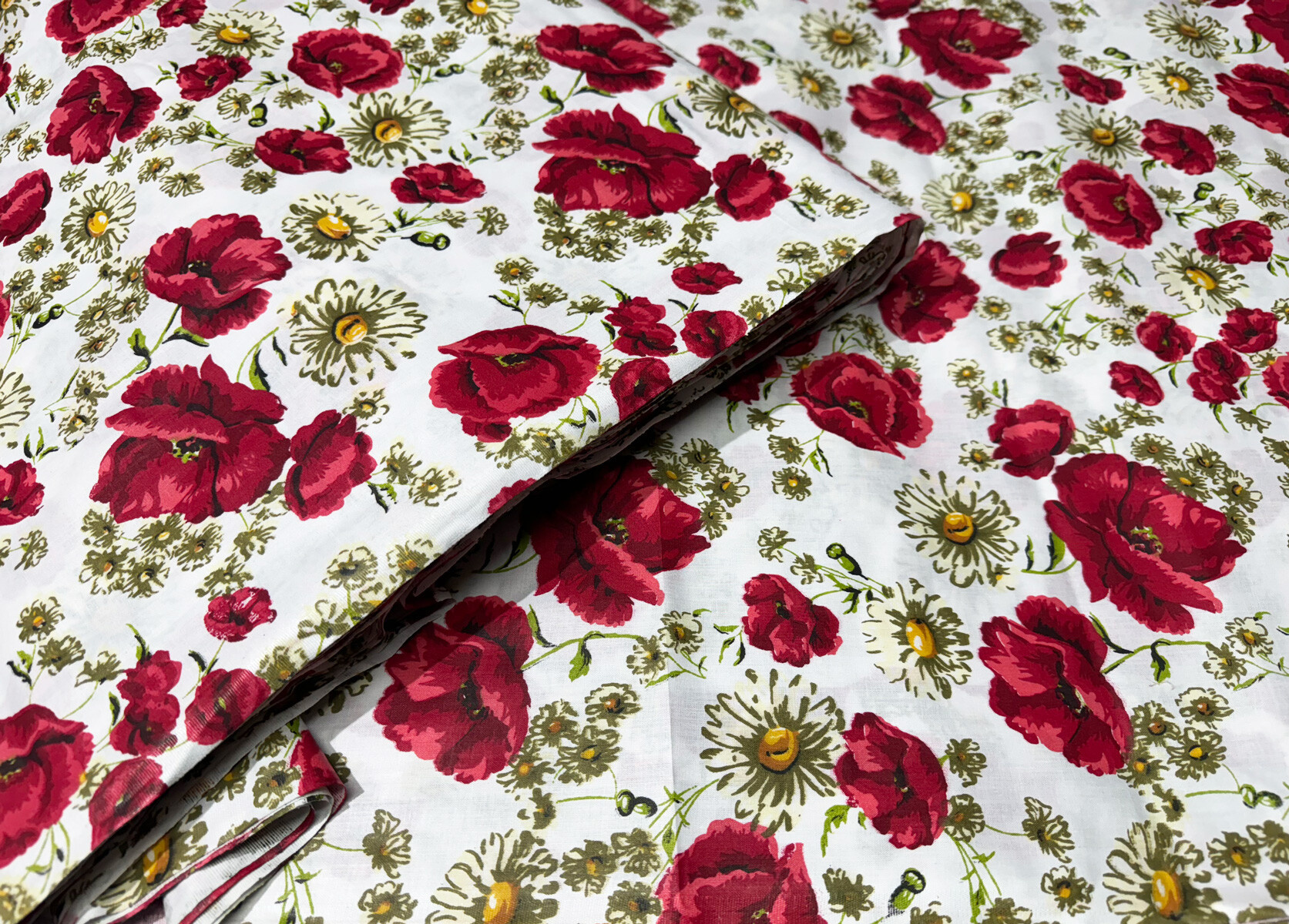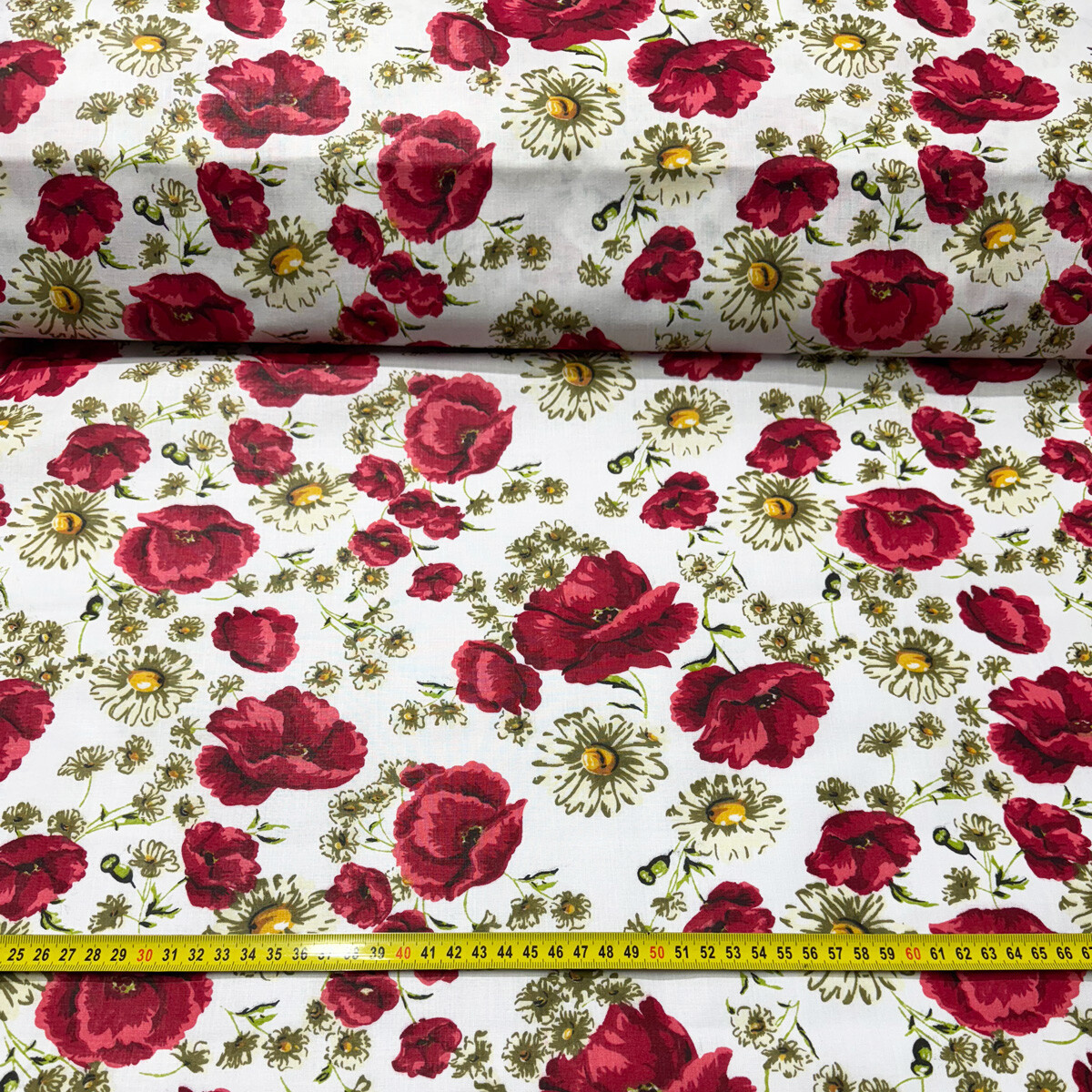 Description Tissu en coton au mètre, 125 g/m², largeur 160 cm, imprimé à pavot sur fond blanc