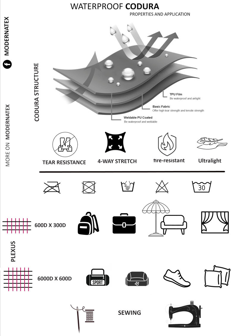 Utilisé pour la fabrication de sacs à dos solides, housses de sport, protections de matériel de randonnée et équipements de plein air.