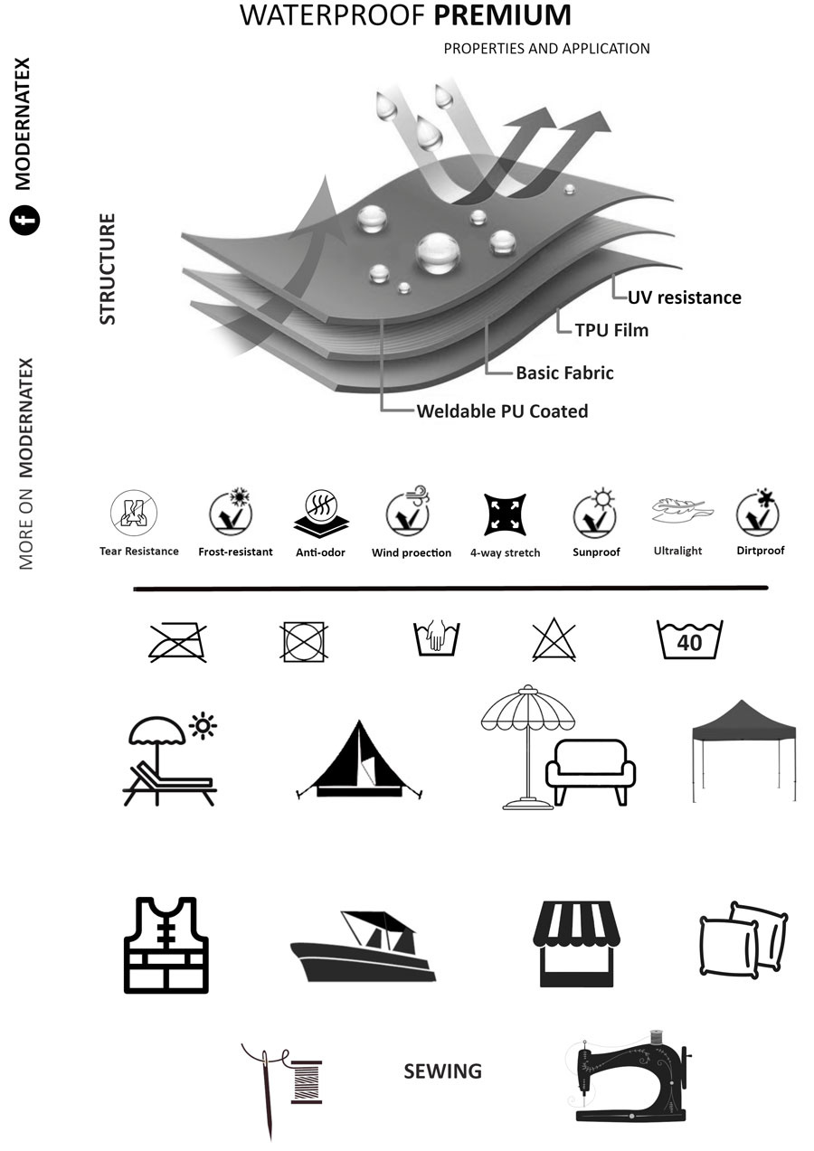 Le tissu PREMIUM imperméable est conçu pour résister aux conditions extérieures les plus exigeantes. Doté d’un tissage dense, d’un revêtement intérieur en polyuréthane (PU) et d’une couche protectrice extérieure en téflon incolore, ce textile offre une excellente imperméabilité, une longévité accrue ainsi qu’une protection efficace contre les taches, la saleté et les rayons UV.