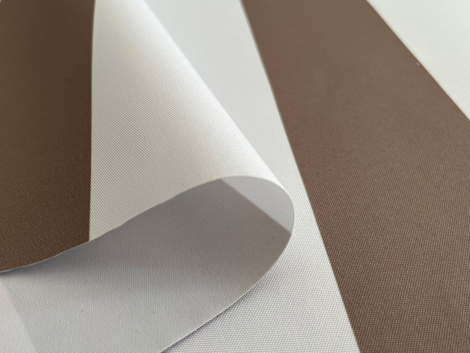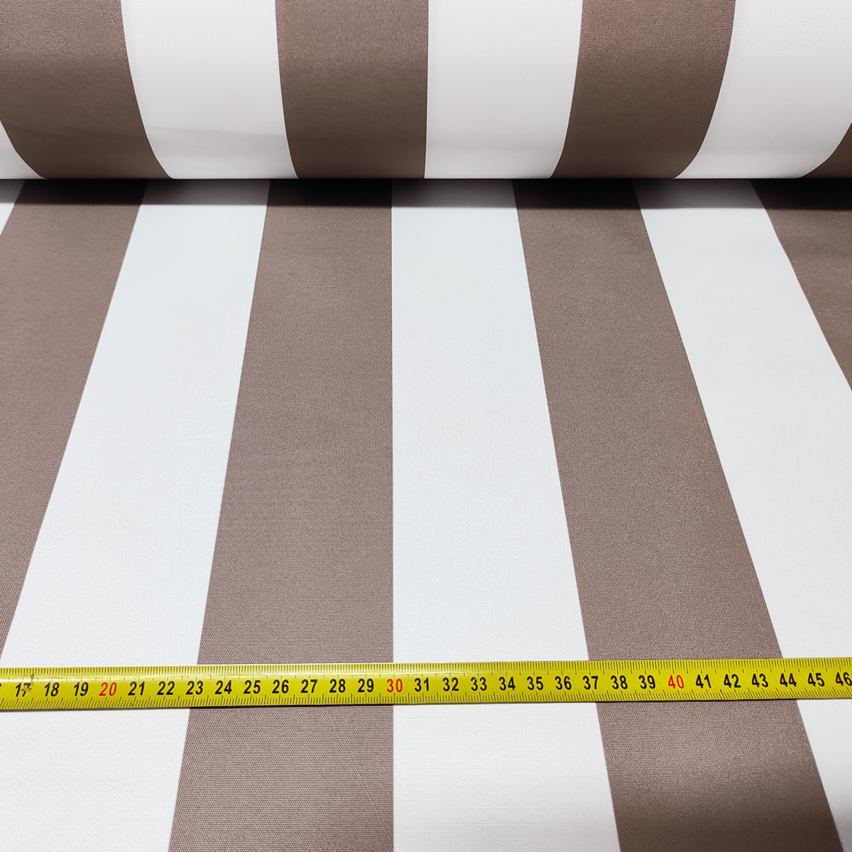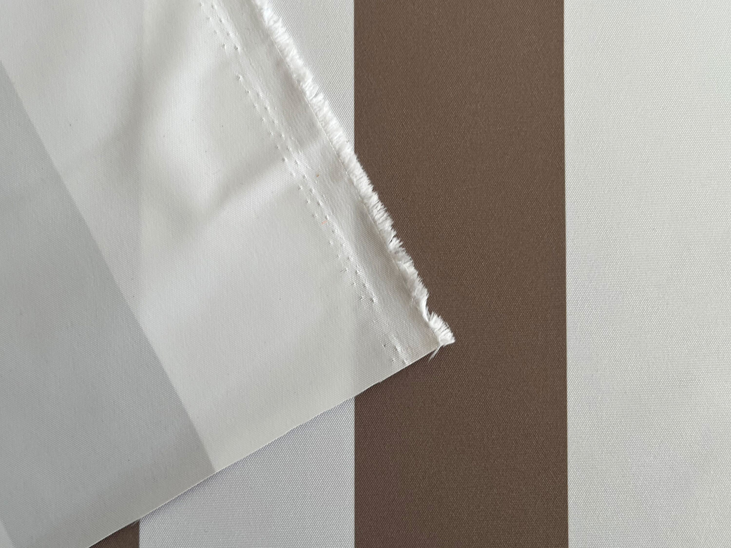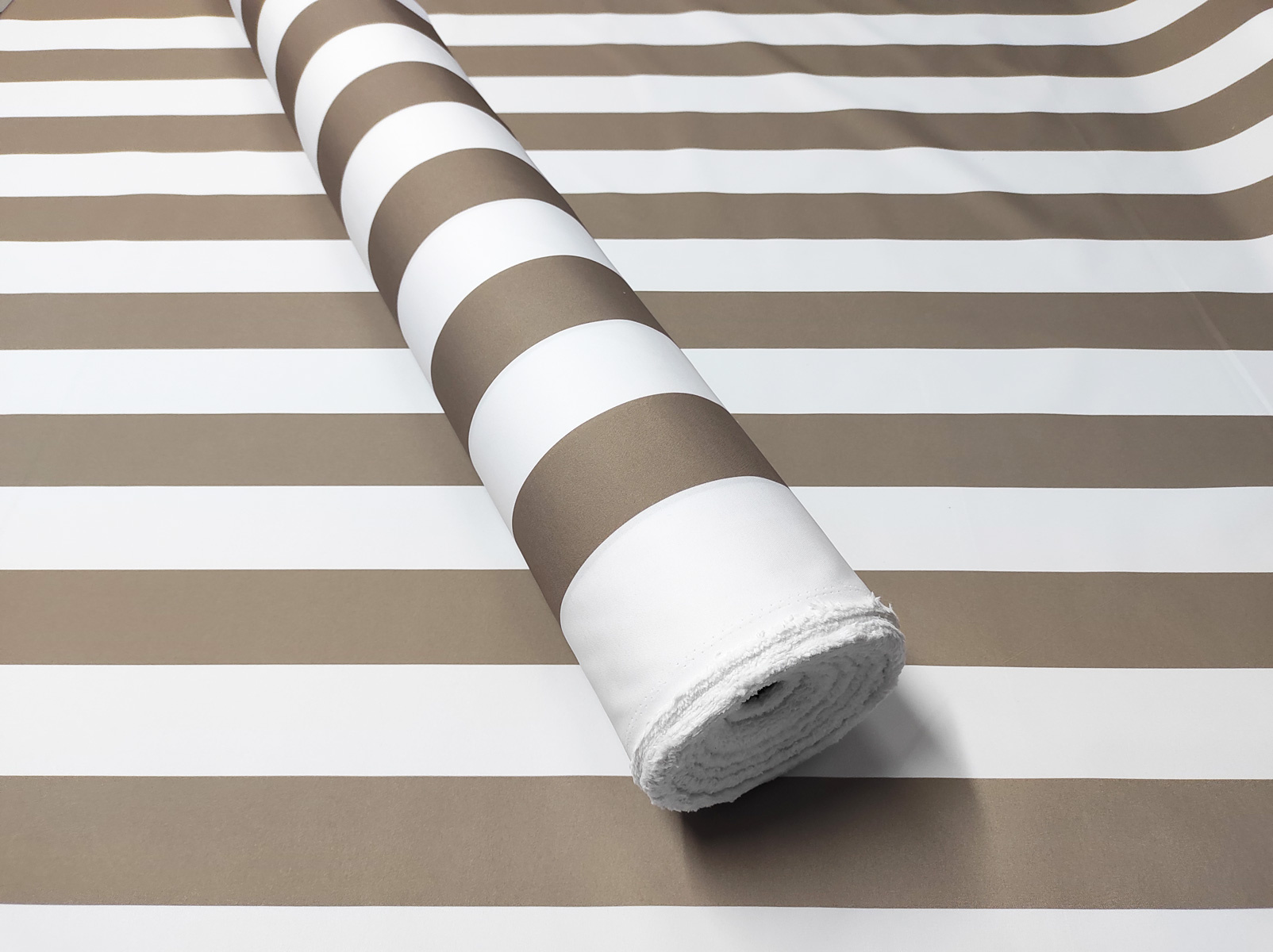 Description Tissu imperméable PREMIUM à rayures cappuccino et blanches, polyester PU, 190 g/m², largeur 160 cm